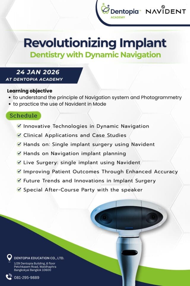 Dentopia Academy ขอเชิญคุณหมอเข้าร่วมคอร์สพิเศษ ที่จะเปลี่ยนวิธีการทำงานของคุณไปตลอดกาล: “Revolutionizing Dynamic Navigation Implant Surgery” นี่ไม่ใช่แค่การเรียนรู้ แต่คือการฝึกฝนทักษะเพื่อความเป็นเลิศ สิ่งที่คุณจะได้เรียนรู้